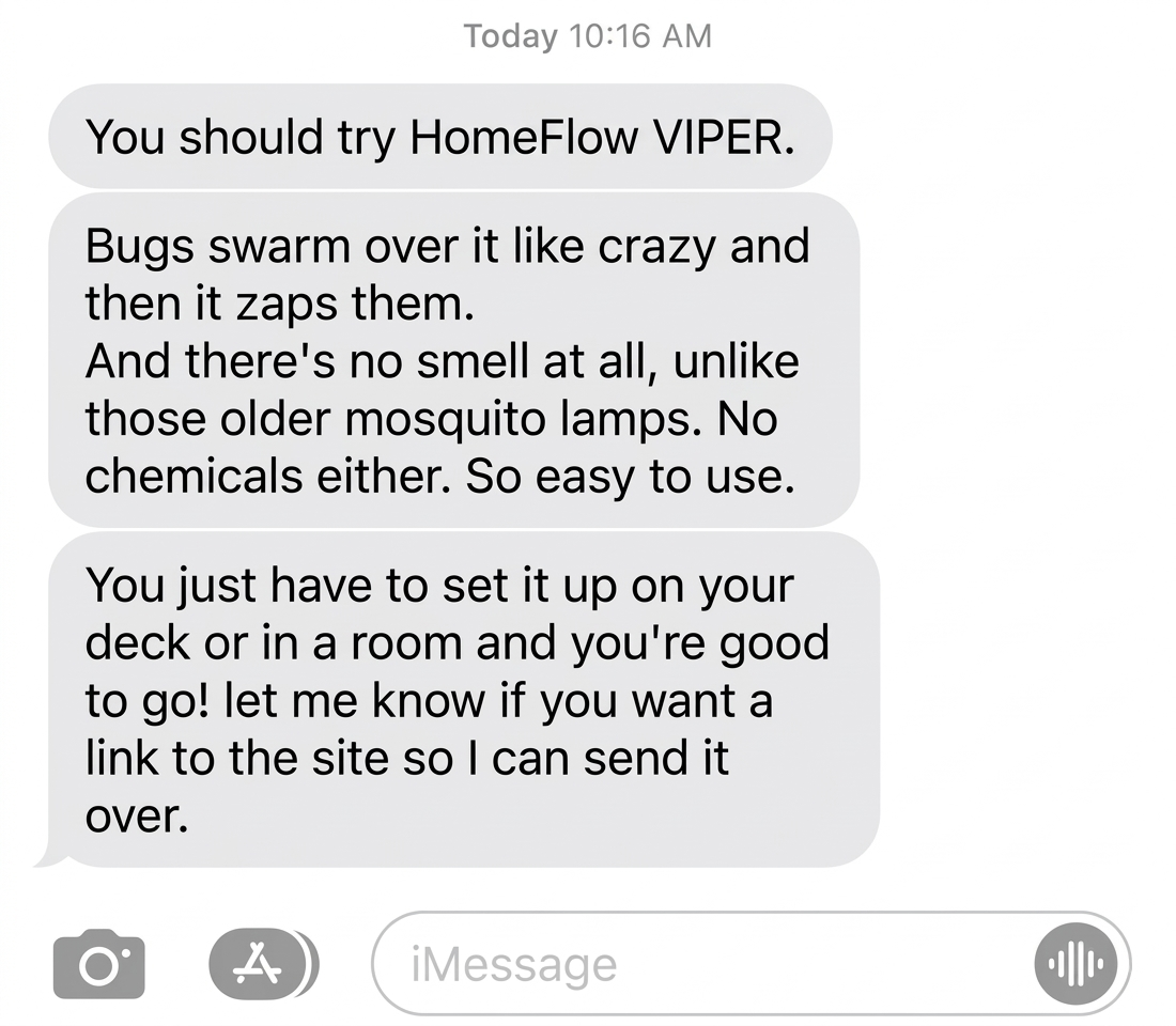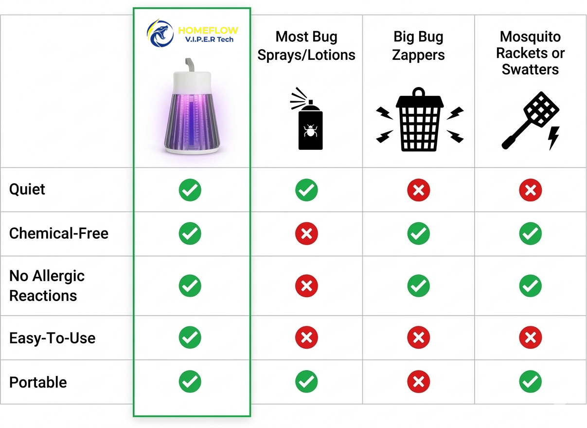 3. Zaps Bugs Quietly – Sick of those bug zappers that sound like a lightning clap every time a mosquito gets in? Homeflow VIPER works quietly in the background, making it perfect for bedrooms, offices, and even babies' bedrooms.
